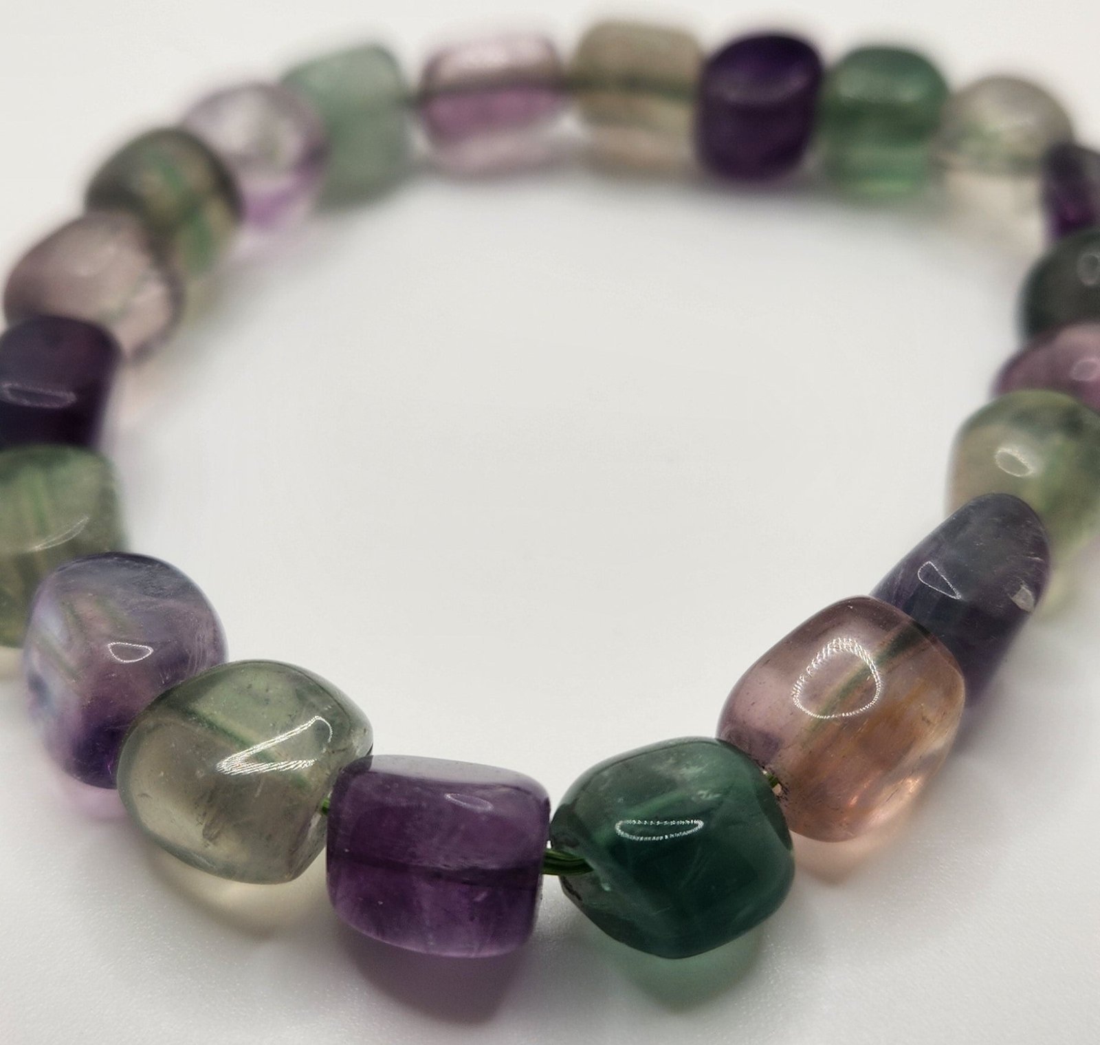 Rainbow fluorite is reputed for its calming and healing properties, often associated with enhancing mental clarity, reducing stress, and fostering balance in life. Wearing this bracelet not only adds a captivating accessory to your collection but also serves as a subtle reminder of inner peace and wellbeing. Whether you’re drawn to its aesthetic allure or its holistic benefits, the tumbled fluorite stones bring both beauty and intention into your daily routine.