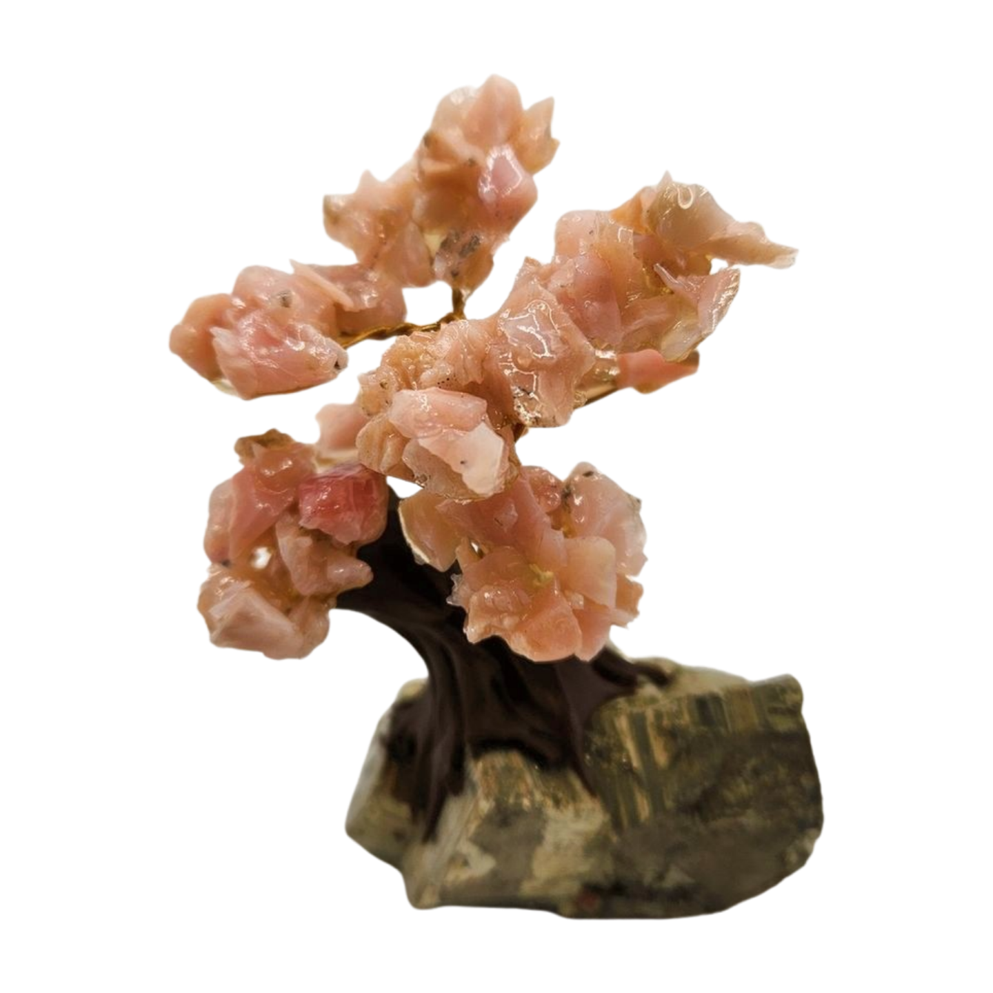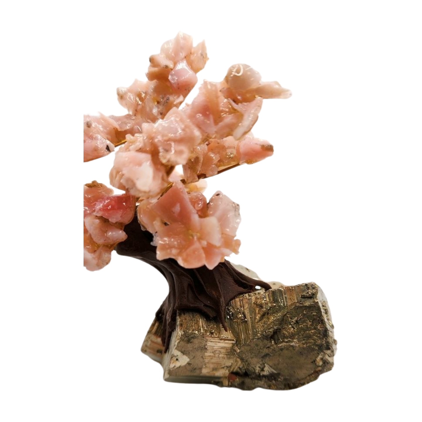 This handcrafted gemstone bonsai tree pairs the soft, soothing beauty of Pink Opal with the bold, metallic strength of a solid Iron Pyrite base, creating a stunning fusion of calm and confidence. The tree’s branches are adorned with raw Pink Opal chips in gentle blush and peach tones, giving it a warm, uplifting, and heart-centered presence. Each stone catches the light with a natural, glossy shimmer, making the tree look delicate, vibrant, and full of life.
