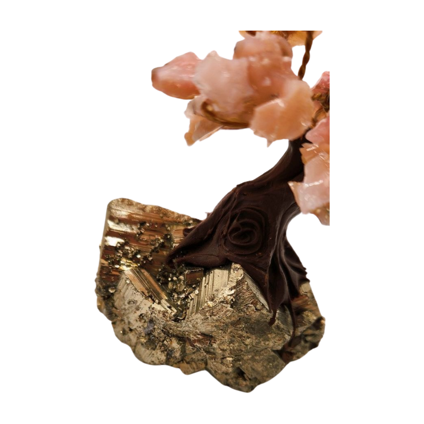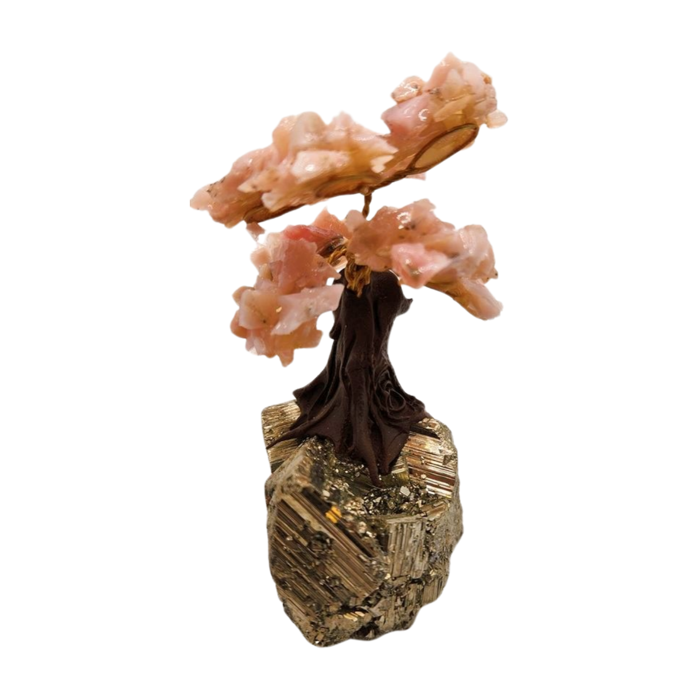 The trunk is sculpted in a flowing, organic form, rising from a weighty pyrite foundation that sparkles with gold-like metallic crystals. Pyrite adds grounding, stability, and protective energy — a powerful counterbalance to Pink Opal’s emotional softness and compassion.